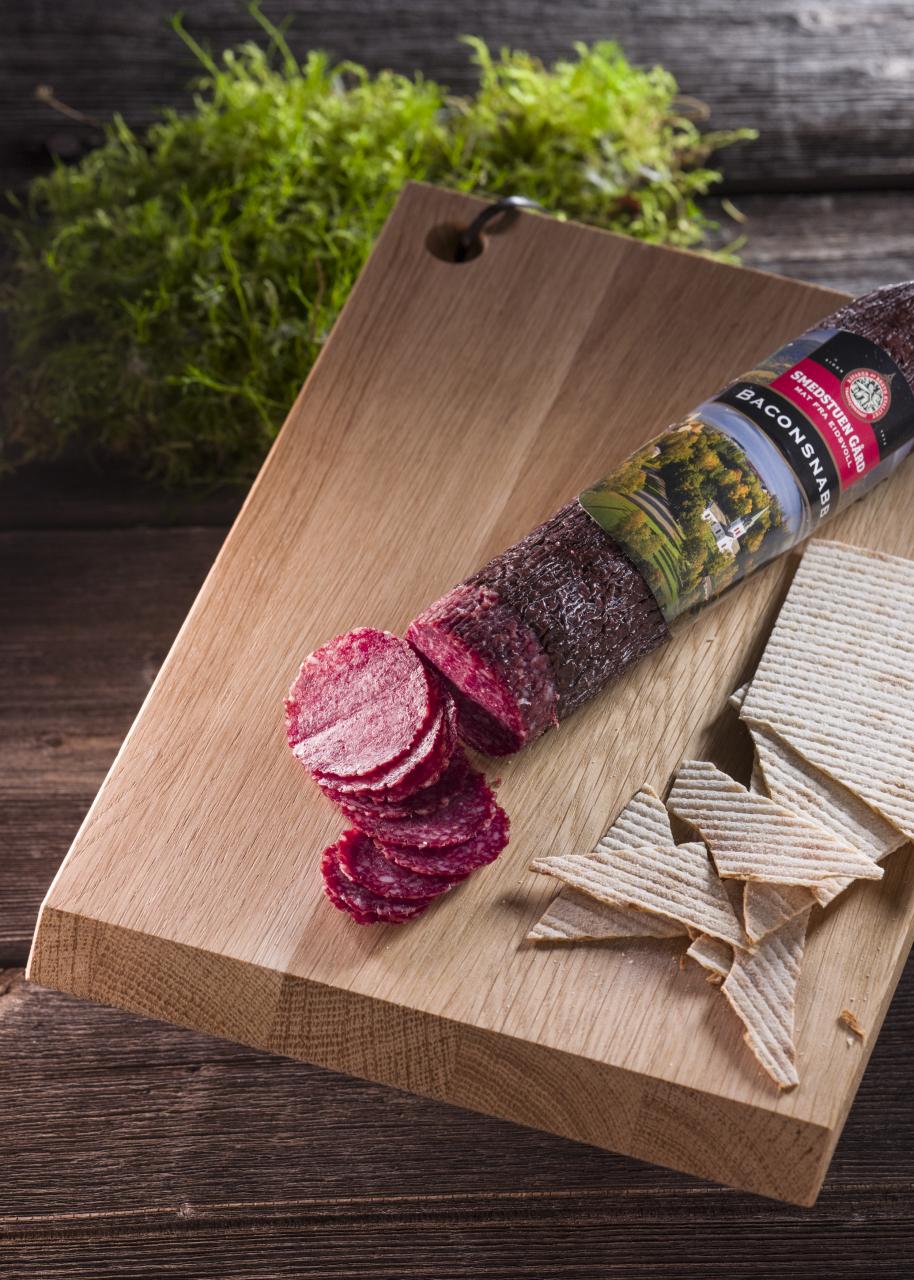 Baconpølsen fra Smedstuen Gård er en av våre mest populære produkter – og det er lett å skjønne hvorfor. Denne spekepølsa med ekte baconbiter kombinerer den tradisjonelle smaken av norsk spekemat med den rike, røkte karakteren fra bacon. Resultatet er en grov, saftig og fyldig spekepølse som passer perfekt på tapasbordet, til koldtbord eller som turmat.