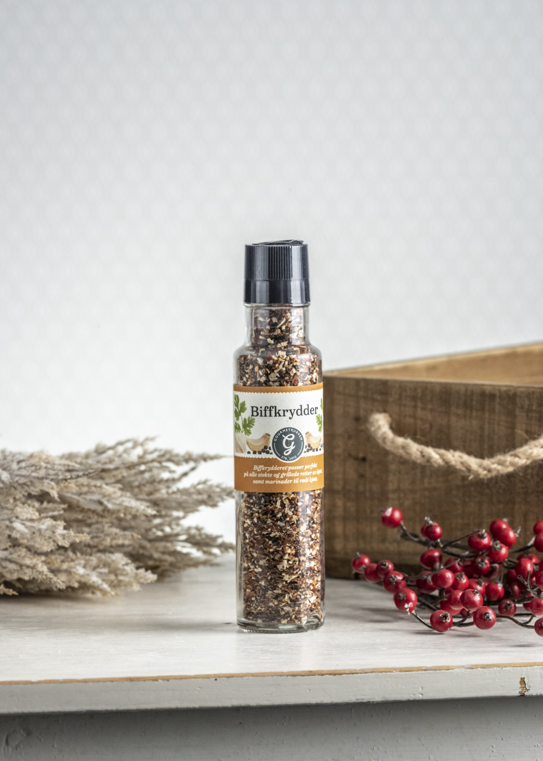 Dette biffkrydderet er laget for å gi biffen en rik, aromatisk smak som virkelig fremhever kjøttets naturlige saftighet. Perfekt til steking, grilling eller i panne – uansett hvilken tilberedningsmetode du velger, vil dette krydderet gi en fantastisk dybde til smaken.