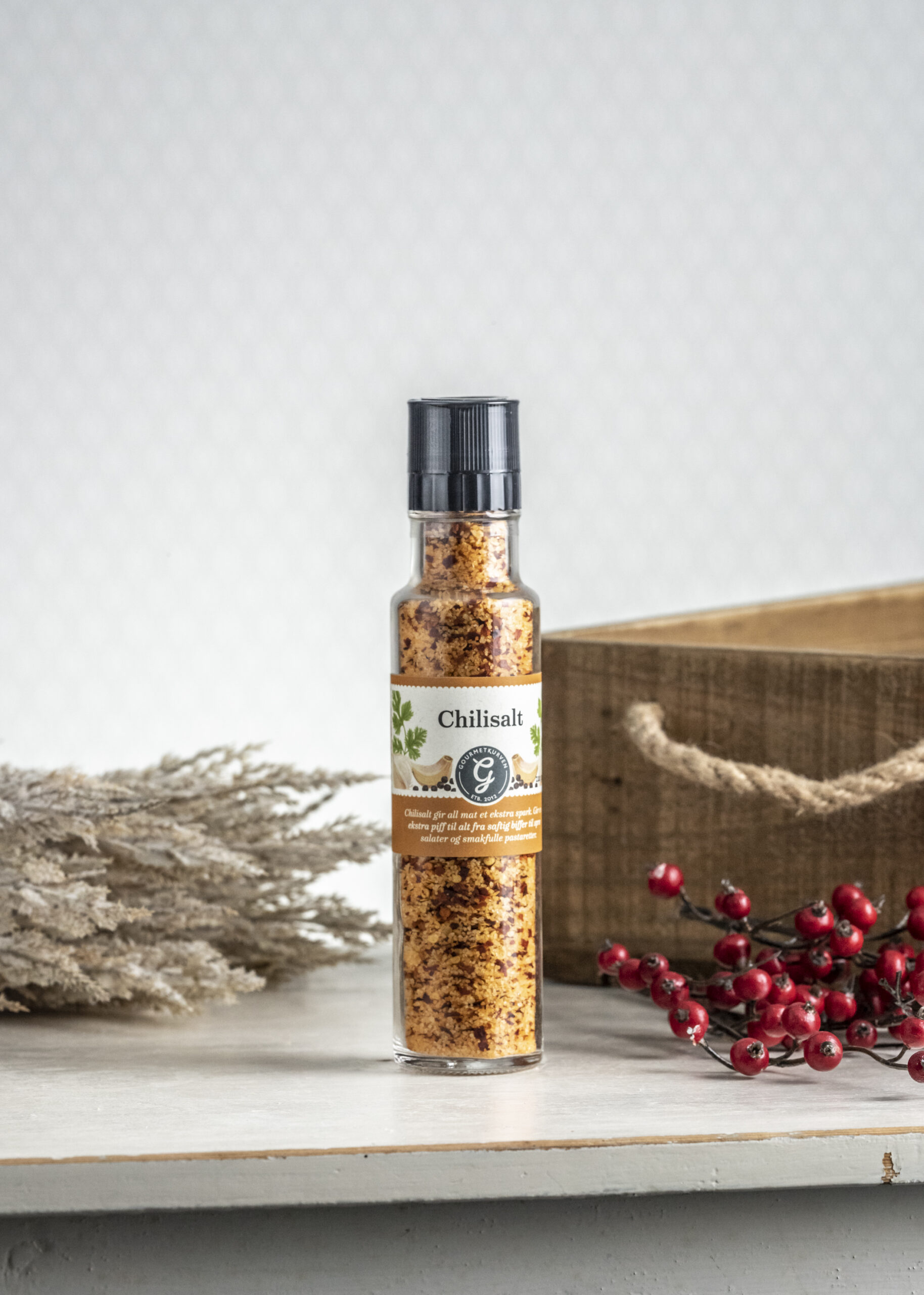Oppdag Chilisalt (220 g) i praktisk glassflaske med kvern – en smakfull blanding av sterk chili, havsalt og et hint av hvitløk. Perfekt krydder til: