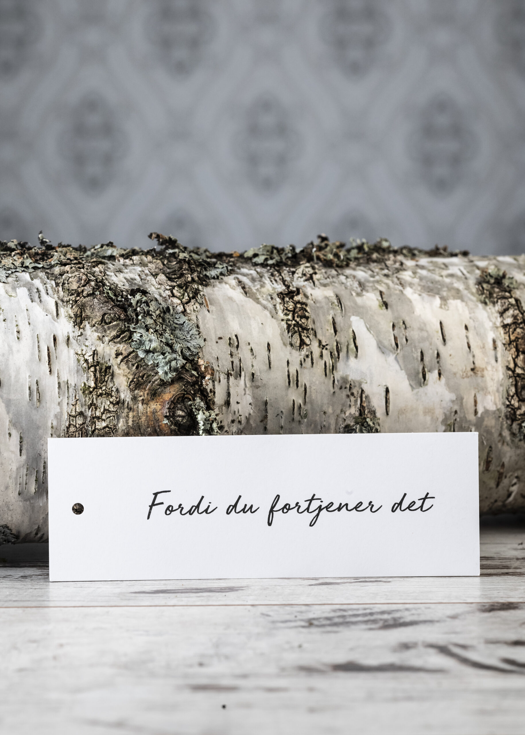 Fordi du fortjener det, hvit tag i størrelse 5×15 cm