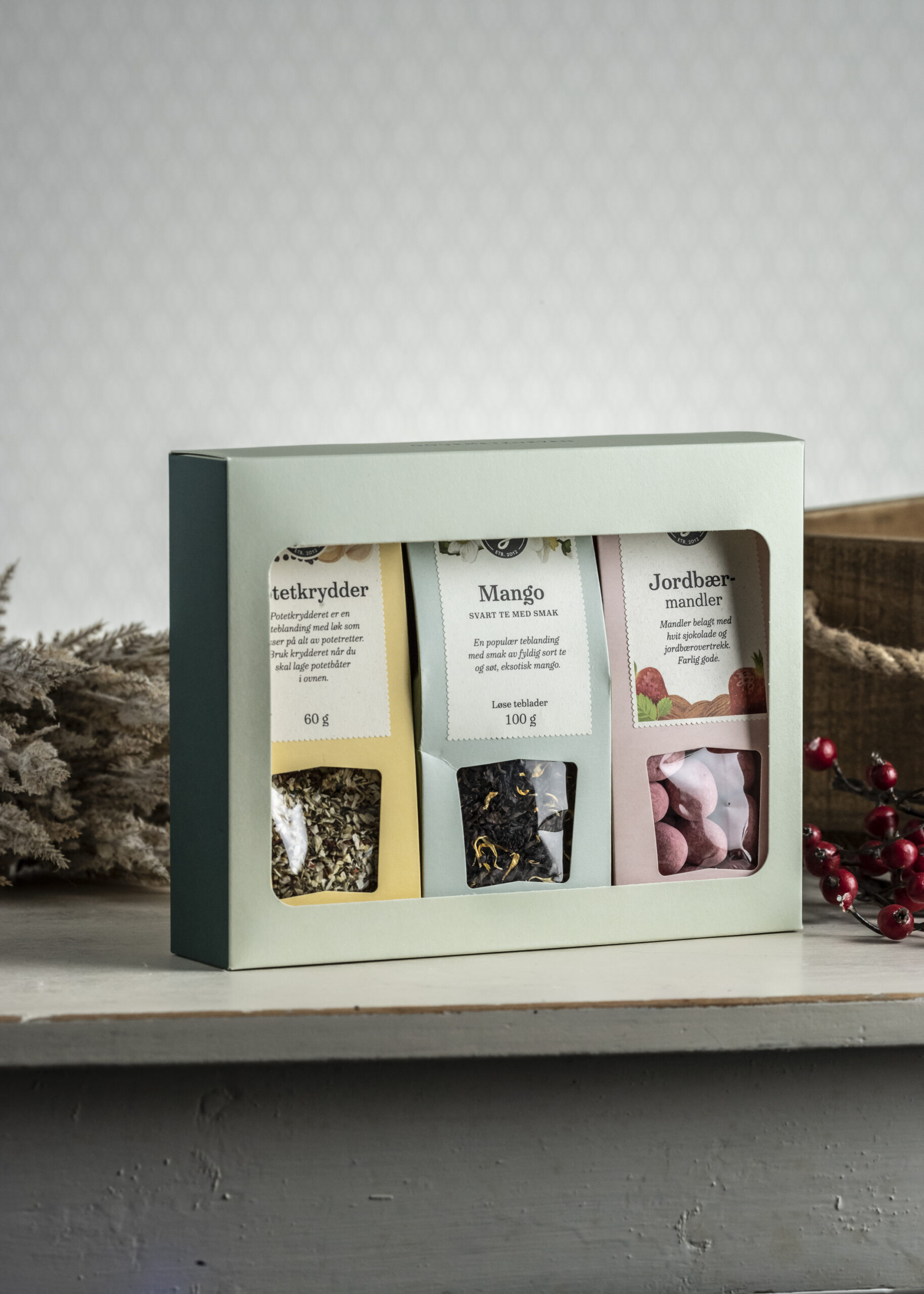 Potetkrydder (60 g) – den perfekte krydderblandingen til ovnsbakte poteter og potetretter. Med løk og nøye balanserte urter som gir ekstra smak og sprøhet. - Mangote (100 g) – en populær teblanding av fyldig sort te med frisk og søt smak av mango. Perfekt både til frokost og kosestund.