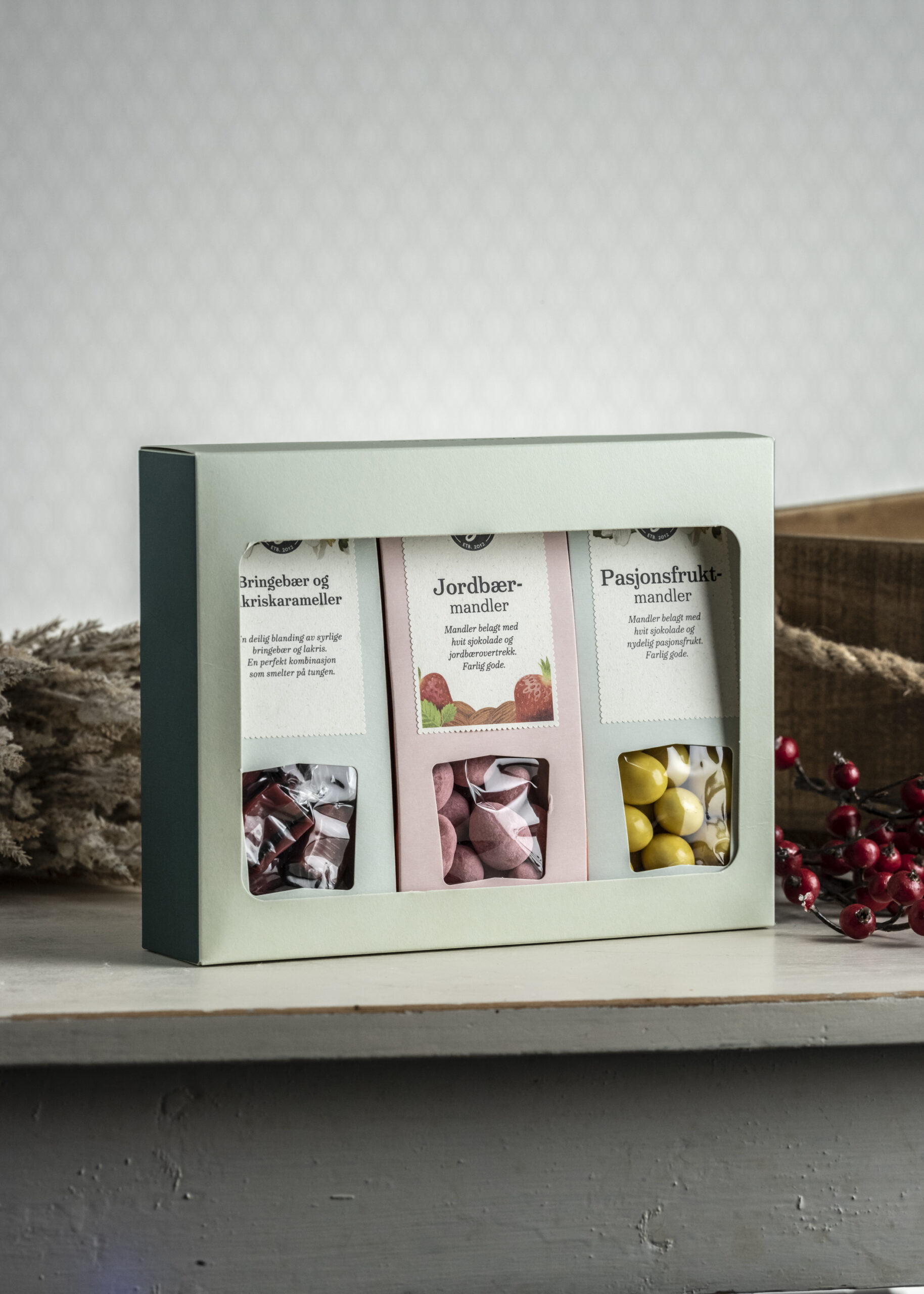 Alle produkter har lang holdbarhet og tåler romtemperatur, noe som gjør gaveesken enkel å oppbevare og gi bort året rundt.
