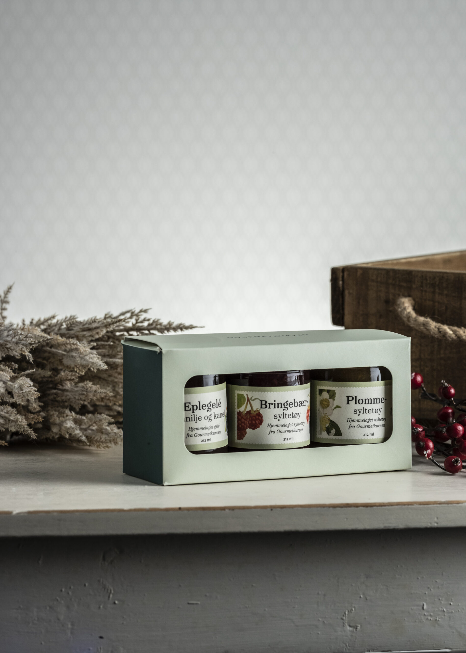 Gaveeske med syltetøy og gelé (3 x 212 ml) inneholder: