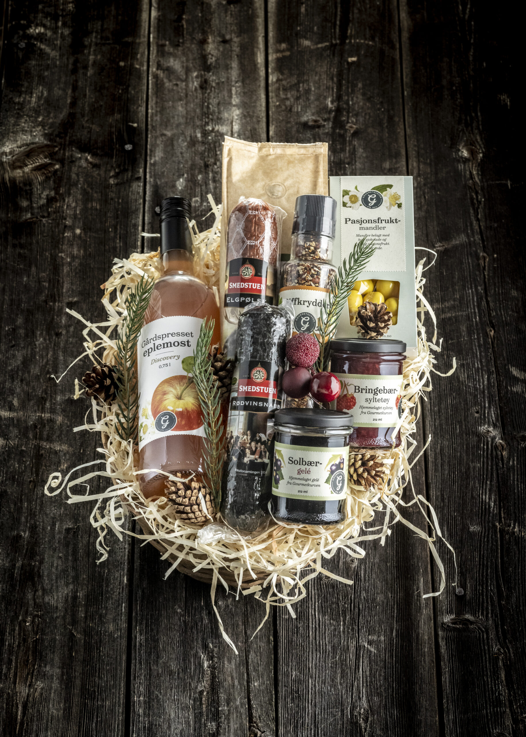 Produktbeskrivelse – Gavekurv med delikatesser fra Smedstuen Gård
