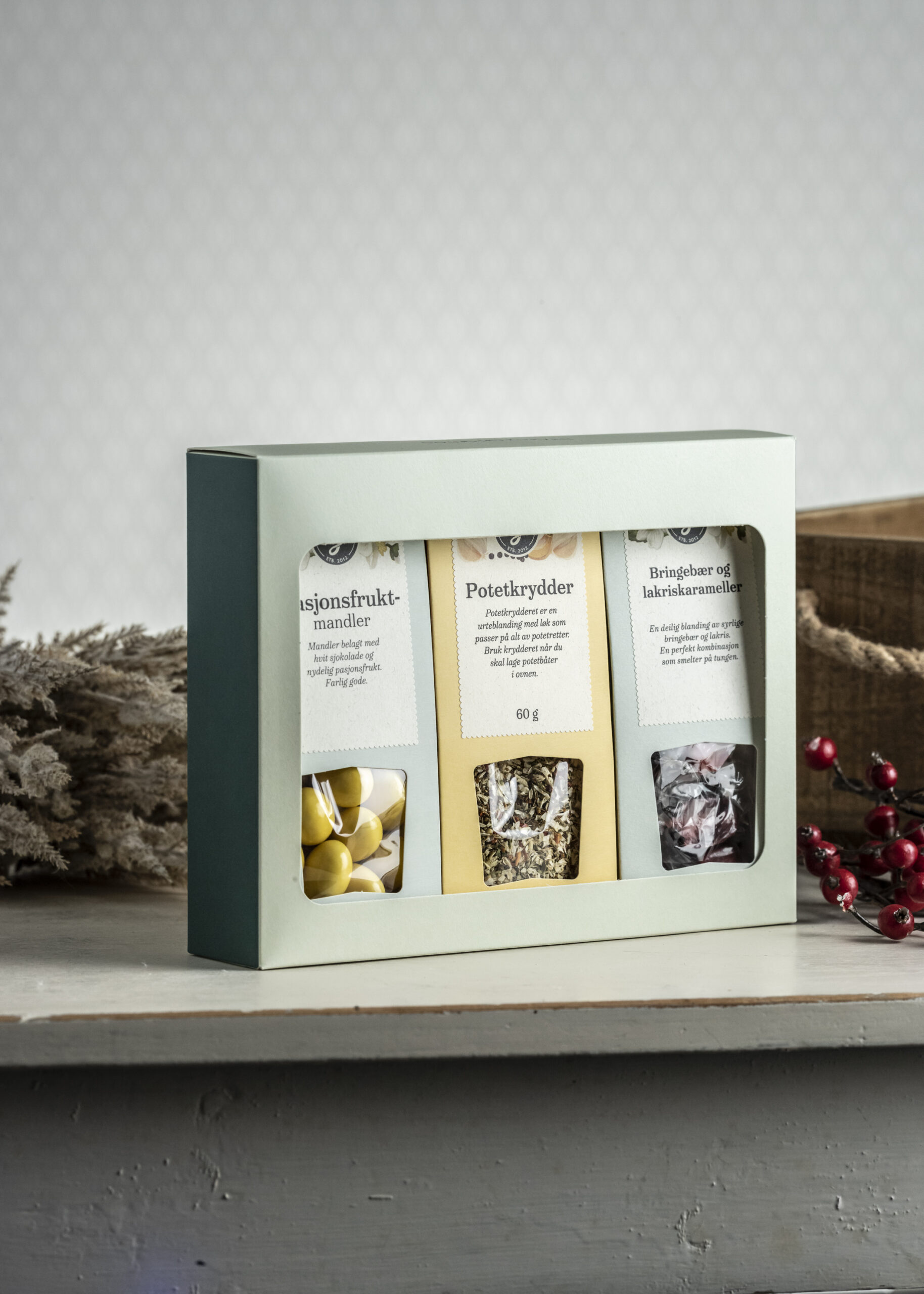 Alle produkter har lang holdbarhet og tåler romtemperatur, noe som gjør gaveesken enkel å oppbevare og gi bort året rundt.