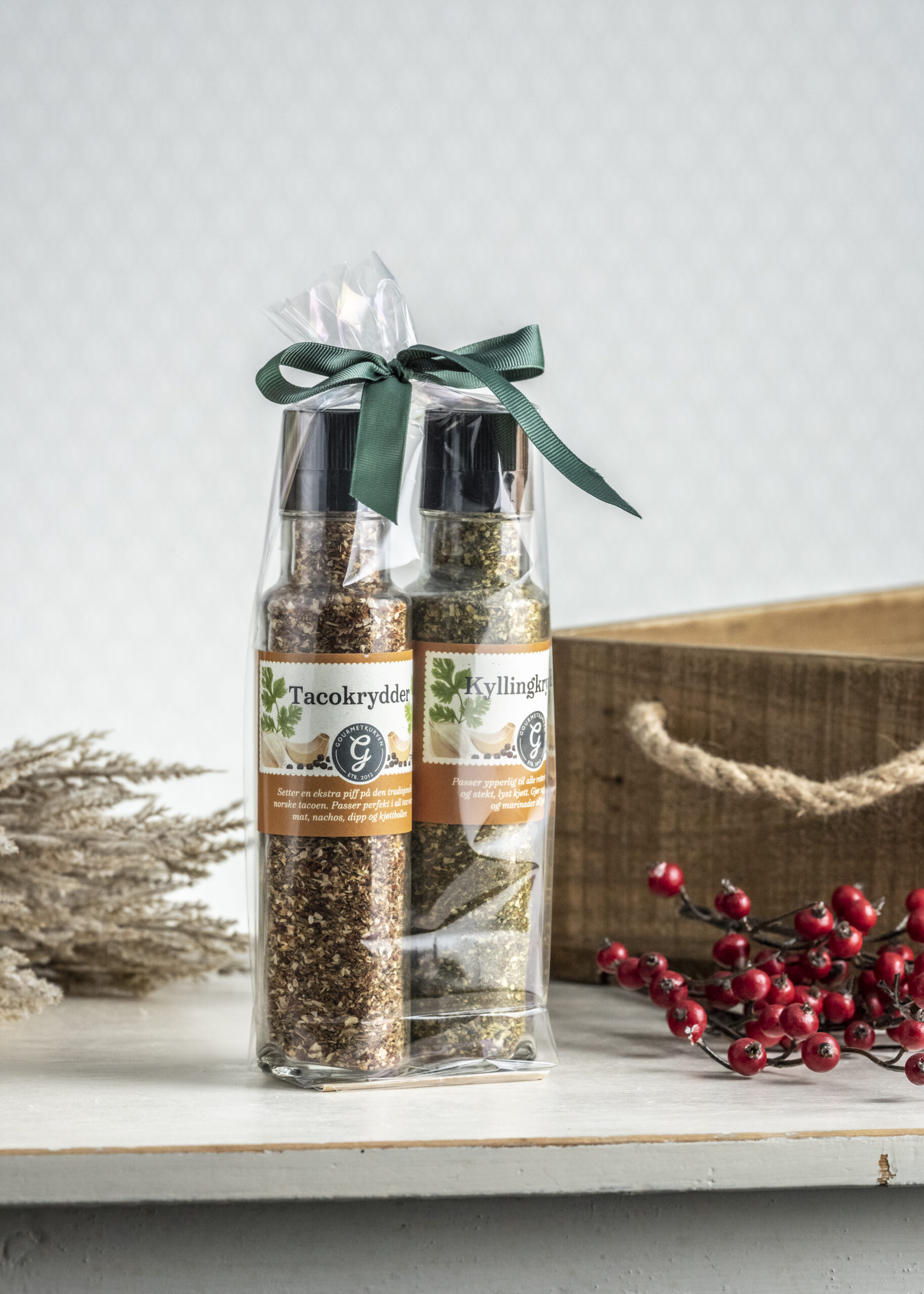 Gavepakningen inneholder to smakfulle krydderblandinger: ett for taco og ett for kylling. Taco-krydderet gir en autentisk smak til alle dine taco-måltider, mens kyllingkrydderet tilfører ekstra smak til både grillretter og stekt kylling. Begge krydderne er enkle å bruke og passer perfekt til både hverdagsmiddager og festmåltider.