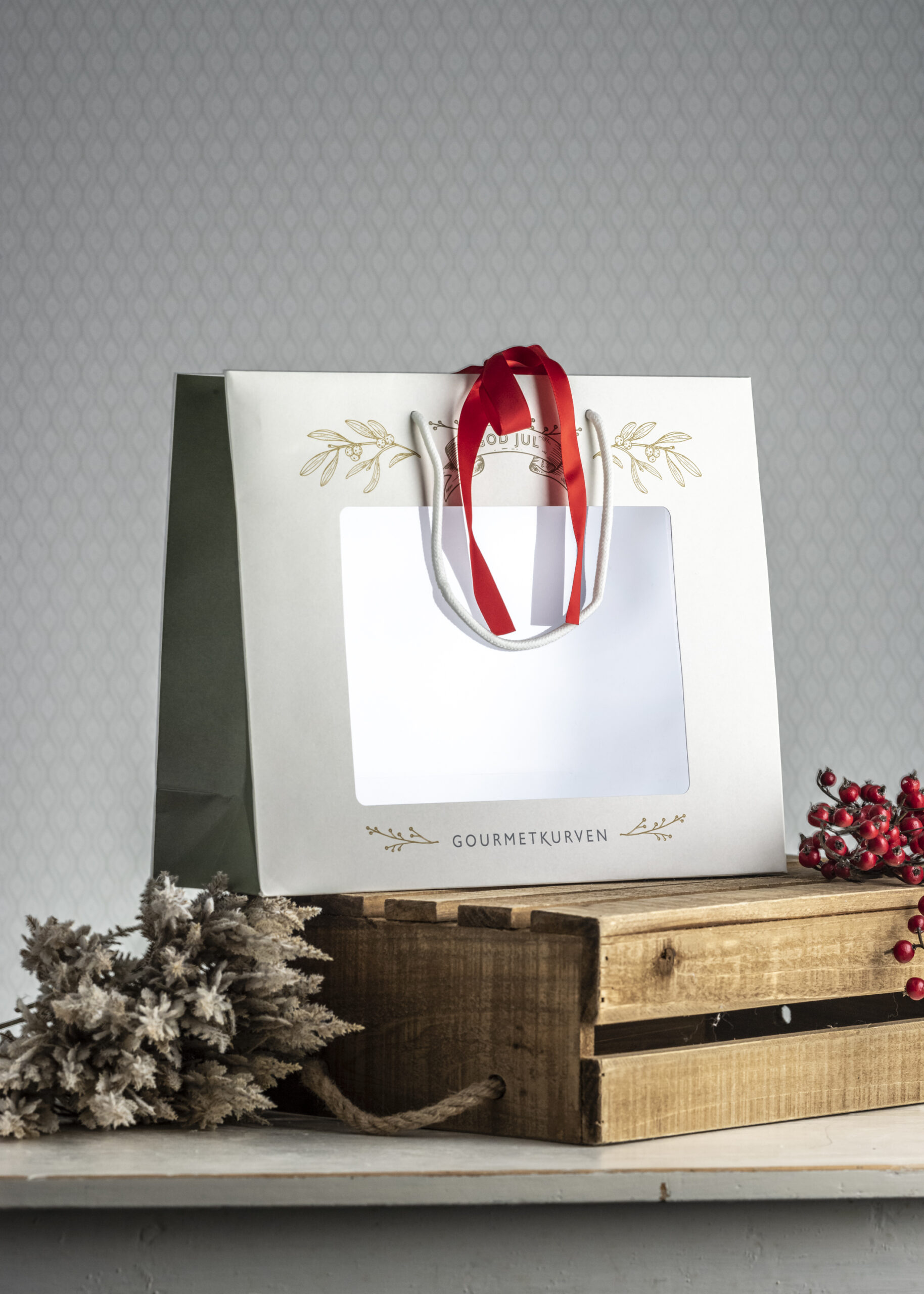 Gjør julegaven ekstra spesiell med en gavepose fylt med smakfulle delikatesser fra Gourmetkurven.
