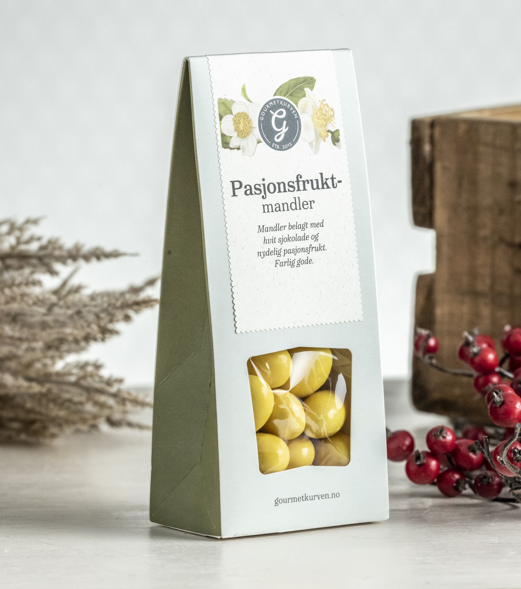 Pasjonsfruktmandler 120 gram. Mandler er belagt med hvit sjokolade med smak av pasjonsfrukt. Produktet er pakket i papirsjaktel med vindu og fin etikett. Pasjonsfruktmandler er søte og gode. Har du lyst til å smake disse kvalitetsgodteri av beste sort?