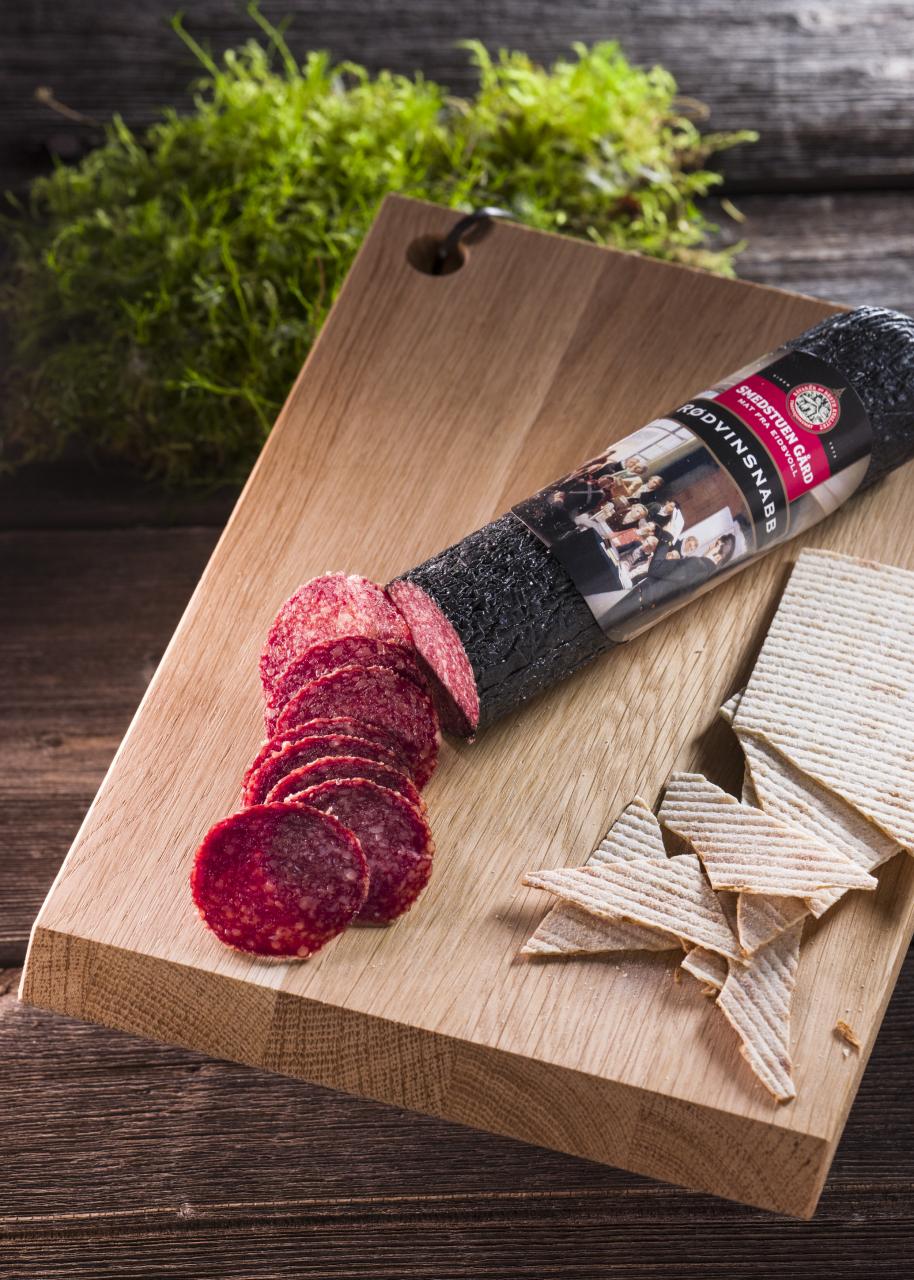 Rødvinspølse fra Smedstuen Gård, 300 gram, har en mild og rund smak. Den er laget av nøye utvalgte råvarer som gir en myk og balansert smak. Den passer perfekt til eggerøre, tapasbord, ost og kjeks – eller som et smakfullt innslag i matpakken.
