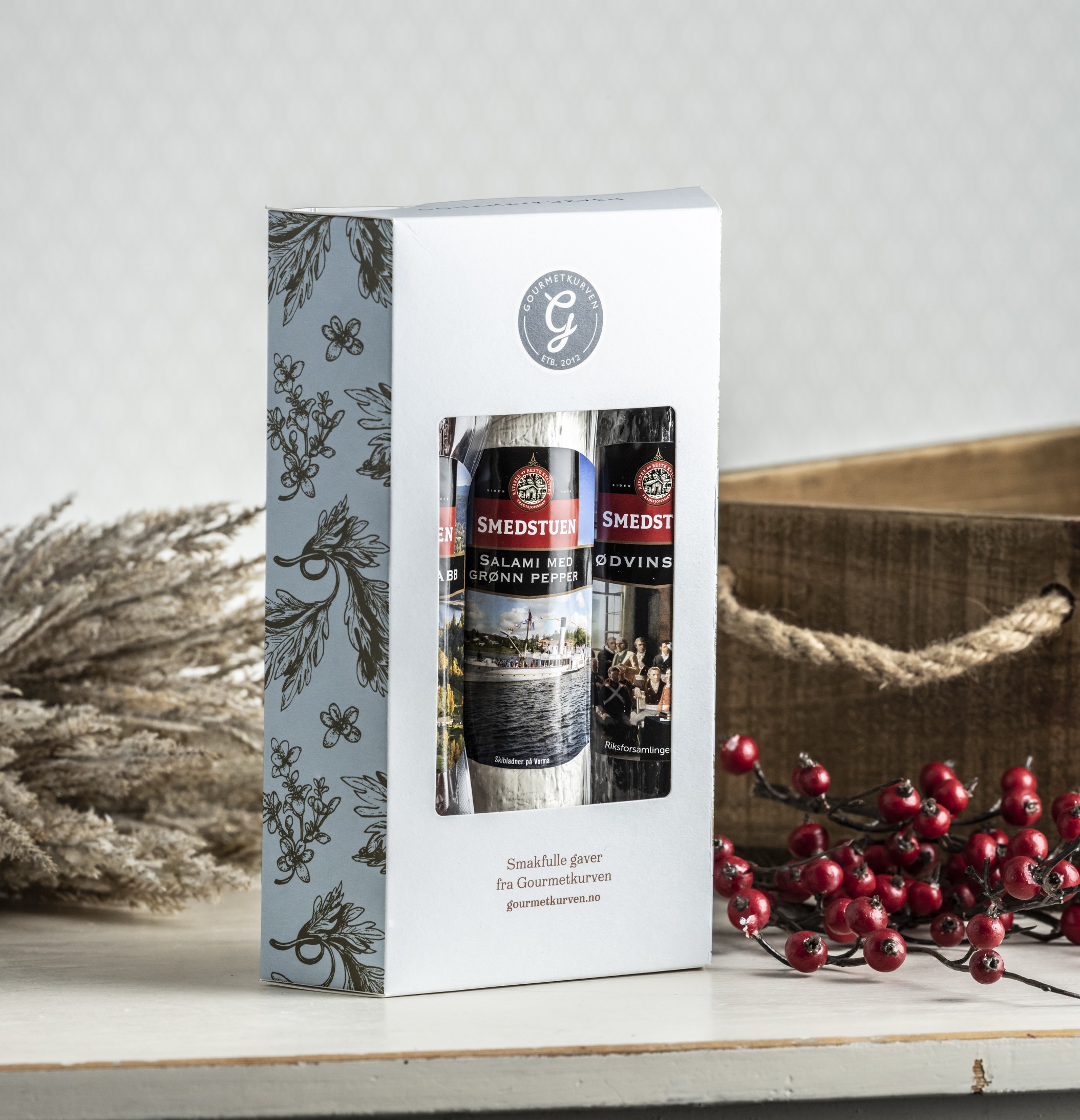 Denne forseggjorte gaveesken med spekemat inneholder tre av våre mest populære spekepølser fra Smedstuen Gård. Alle pølsene er laget etter tradisjonelle oppskrifter fra Smedstuen Gård og byr på ekte norske smaker – en gave som gleder både venner, familie og kollegaer, uansett anledning.